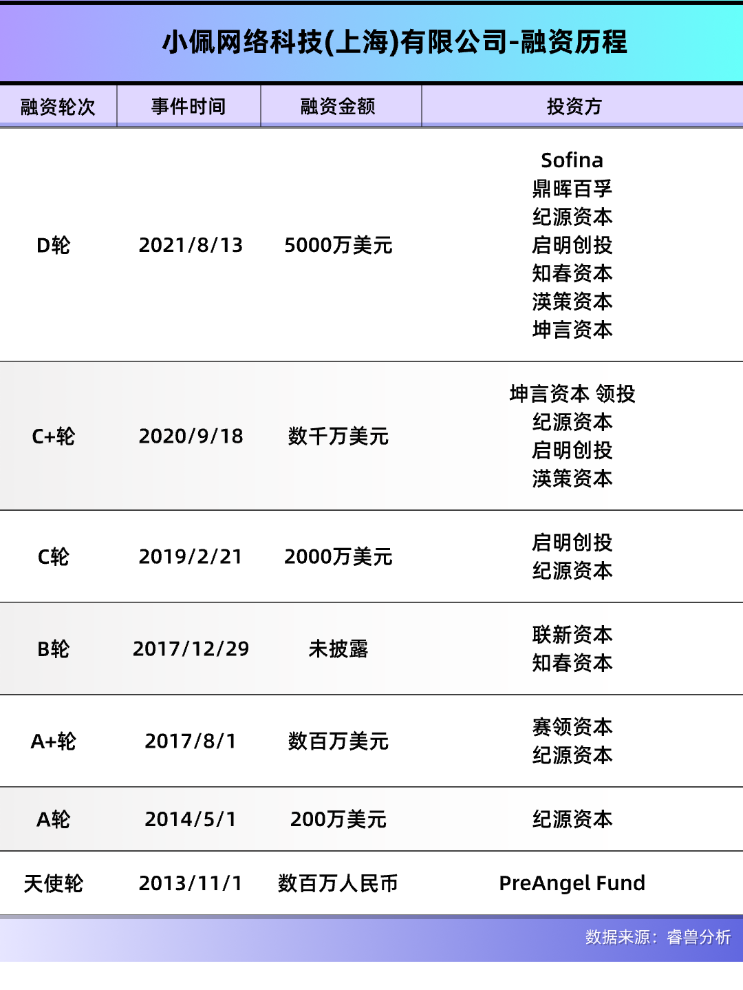 自成立以来,小佩已完成7轮融资,最新一轮是2021年8月的5000万美元D轮融资,投资方包括Sofina、鼎晖资本、纪源资本等。