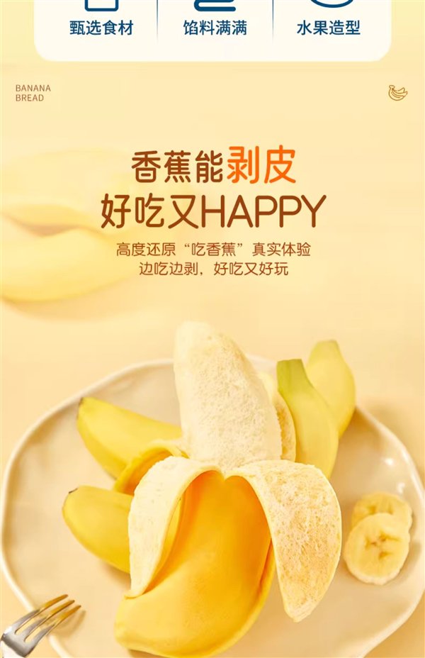 芒果面包七分面包三分酱;香蕉面包香蕉果粉≥12%;哈密瓜吐司天然果蔬粉上色;橙子布丁、云蛋糕鸡蛋含量≥40%。