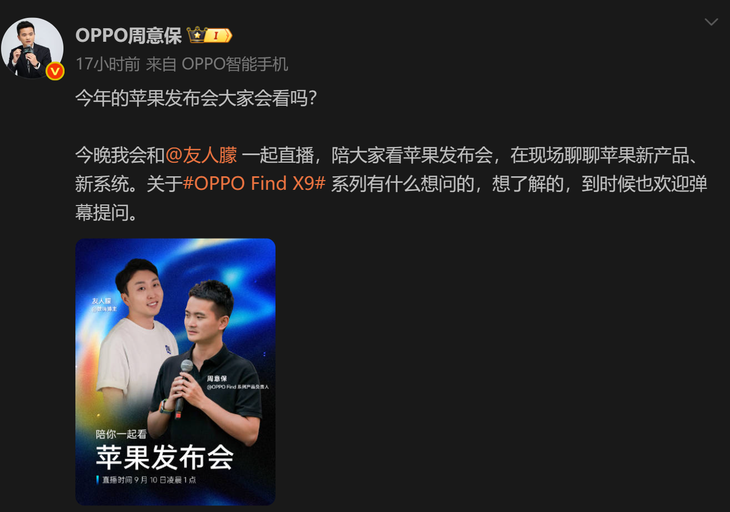凌晨1点,苹果发布会直播时,OPPO Find系列产品负责人周意保也在一边观看直播一边爆料Find X9系列的最新亮点!