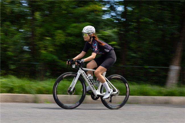 下图是开启佳能EOS R1摇摄辅助功能进行拍摄的运动员骑行的照片。拍摄时快速移动相机追踪运动员,不仅得到了动感十足的照片,放大查看细节,人物面部、头盔的细节清晰可见。足见该功能对于使用摇摄拍摄运动照片时的帮助是非常大的,可以帮助摄影师拍摄出效果更好的赛车这类高速运动题材摄影作品。