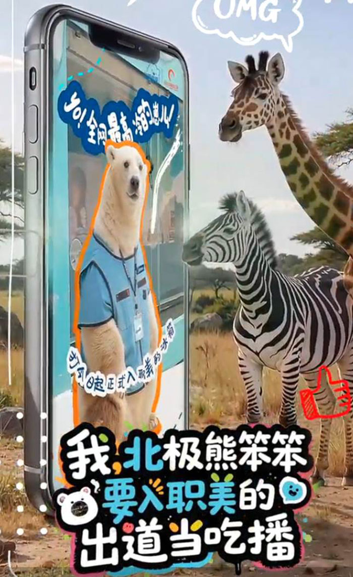 随后,哈尔滨极地公园甩出一支动物们围观北极熊 “笨笨” 的应征的视频,直接让这场 “跨界招聘” 出圈了。视频里,动物们纷纷赶去“看热闹”,笨笨端着慵懒随性的“大佬范儿”:镜头前一坐,自带霸道气场当场官宣要在9月15日18:00来美的冰箱直播间做主播。这波操作一出,不光动物界的“小伙伴”们组团来蹭热度、凑热闹,网友们更是按捺不住好奇心:美的冰箱这波大动作,到底要解锁什么新品?竟能请动北极熊亲自下场开吃播?