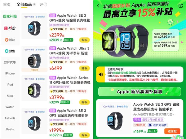快科技9月11日消息,今日,在美团闪购平台搜索发现,Apple Watch新品在该平台开启预售的同时,北京地区消费者已可用国补价预订该新品。