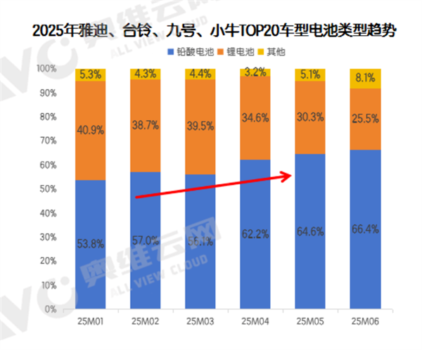 据奥维云网(AVC)数据显示,2025年上半年锂电池份额从40.9%暴降至25.5%,而铅酸电池车型占比从53.8%提升至66.4%,安全与续航优化成为市场竞争关键。