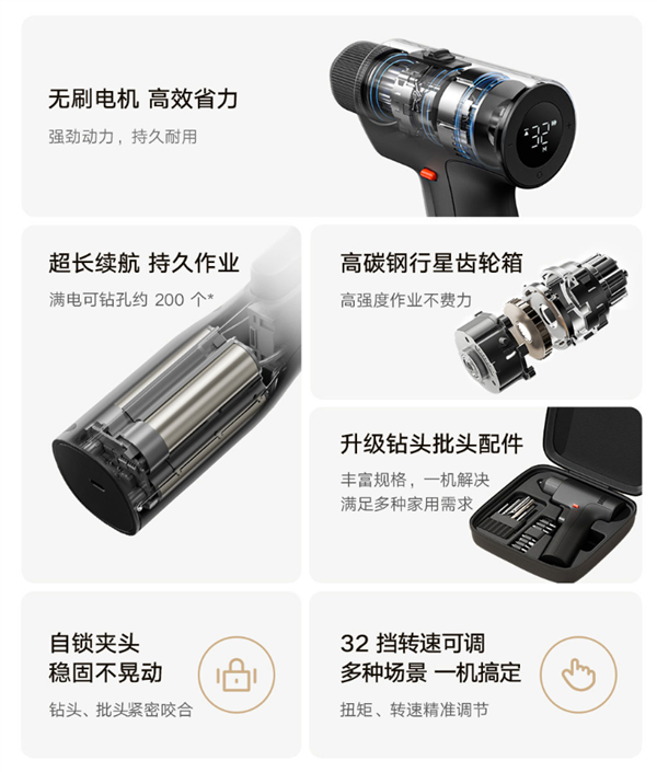 米家无刷电钻2主打家用场景,搭载高性能无刷电机,最大输出扭矩达50N・m,较上一代提升66%;最高空载转速1700转/分钟,较上一代提升21%,可应对高负荷、高频率钻拧需求。