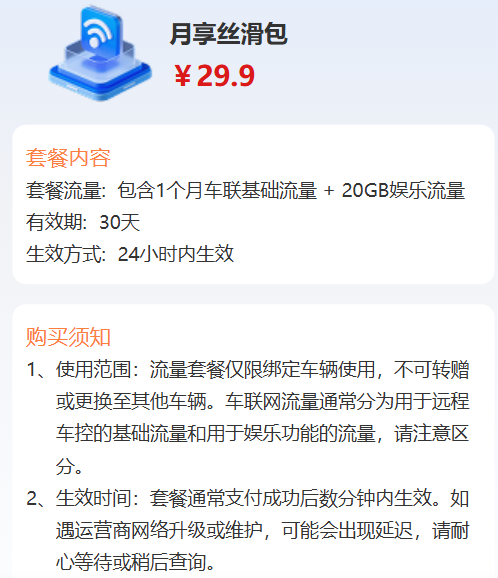 分别为基础功能包、月享丝滑包、全年无忧保、三年尊享包等,价格分别为5.9元、29.9元、299元、699元。其中,29.9元的月享丝滑包,包括1个月车联基础流量,以及20GB的娱乐流量。
