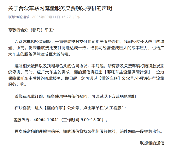 此事引起热议后,“联想懂的”官方今日下午发布了“关于合众车联网流量服务欠费触发停机的声明”。