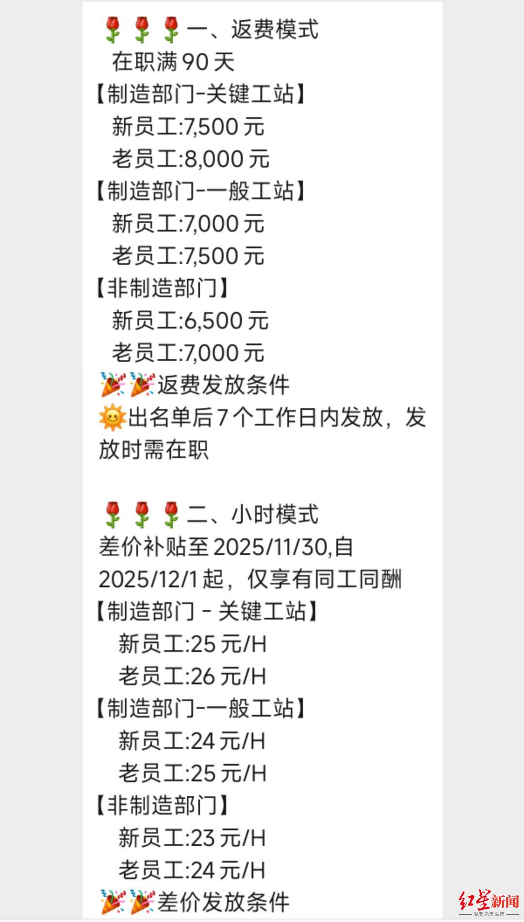 老吴提供的信息显示,目前招工分为返费模式和小时模式。在返费模式下,员工月工资约4000元,在职满90天后,制造部门关键工站的老员工可以拿到8000元的返费,新员工可以拿到7500元;在小时模式下,员工按工作时长计算工资,制造部门关键工站的新员工每小时工资为25元,老员工为26元。
