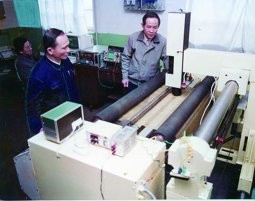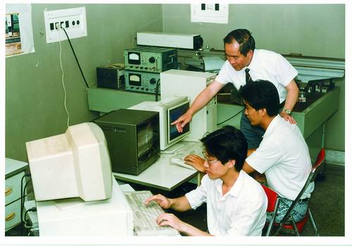 1989年,叶声华(右)与同事进行“七五”攻关项目“金属网测试系统”实验。