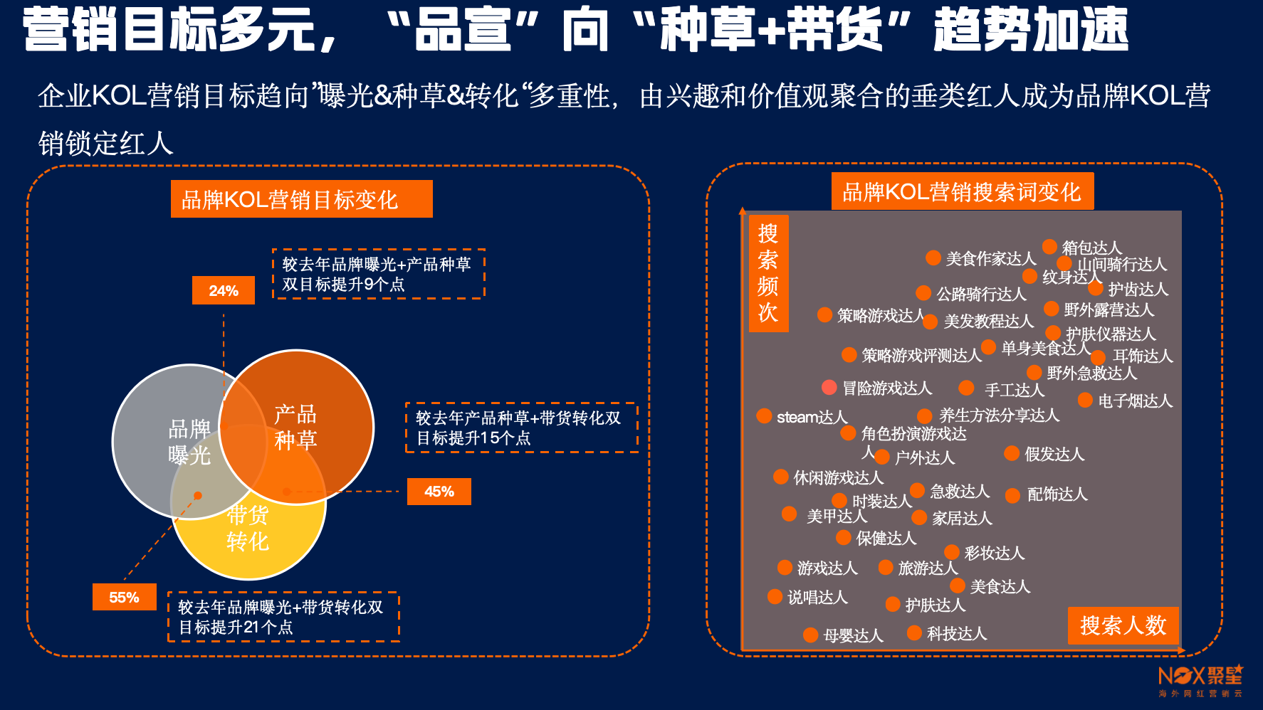 因此,海外红人营销整体呈现从品牌曝光到“种草+带货”的多元化演进,进程持续加速。比如,从搜索次数和频次来看,右上角的“箱包达人、户外、纹身、护齿”等垂类需求频次激增,垂直化趋势凸显,品牌需借力垂直领域红人触达目标受众。