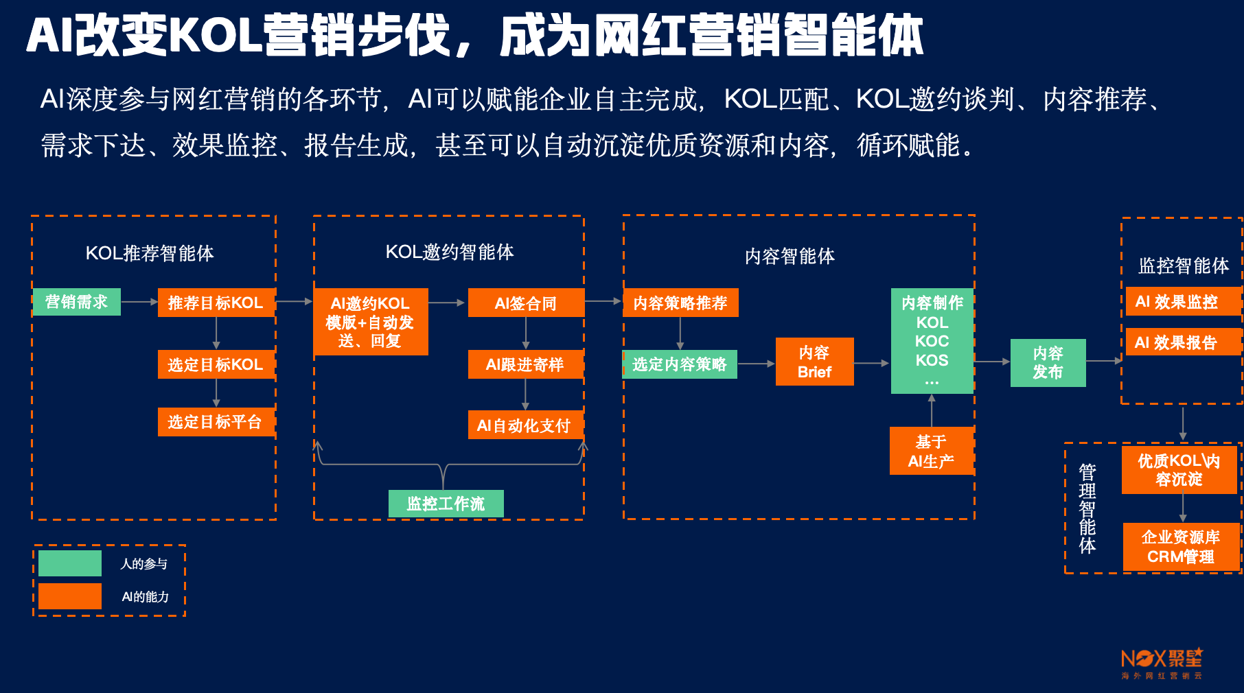 AI大模型的能力改造了各行各业,也深度改造了海外网红营销行业,传统流程中的匹配、邀约合作、内容上线、效果监测等环节已实现AI改造,仅创意环节需人工介入。