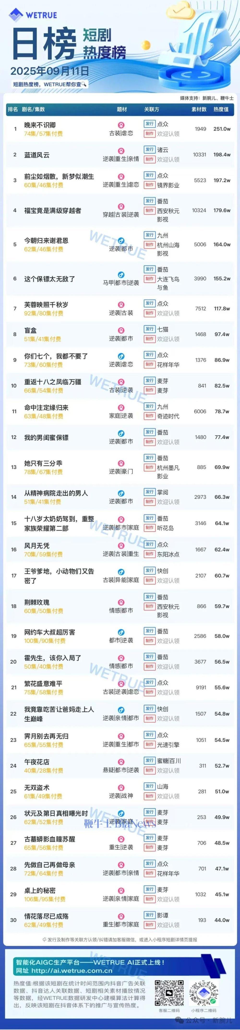 1、本日榜为WETRUE短剧数据公司提供,新腕儿和鞭牛士提供联合支持。