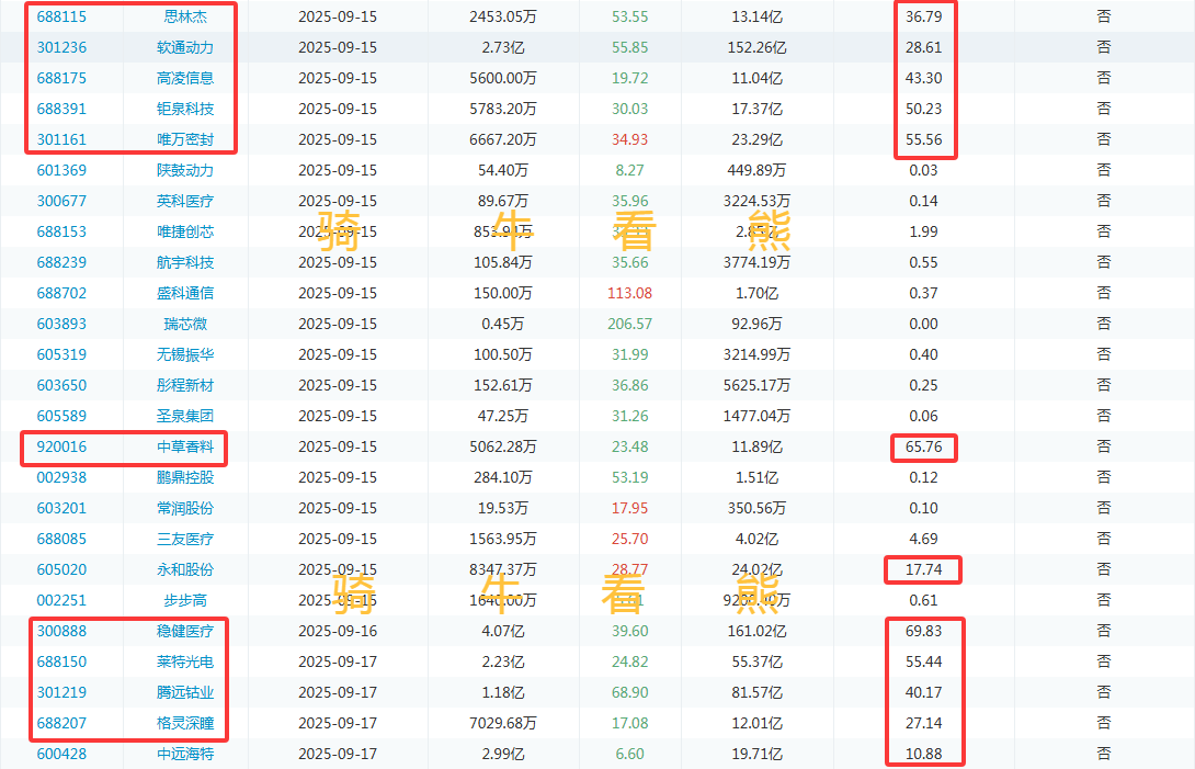 9月15日(周一)、9月17日(周三)是下周解禁的高峰期,并且有部分个股解禁比例已经超过了60%,特别是9月15日(周一)的中草香料;9月16日(周二)的稳健医疗;9月18日(周四)的康冠科技;9月19日(周五)的浙江正特。一定要注意这些个股不要“踩雷”。