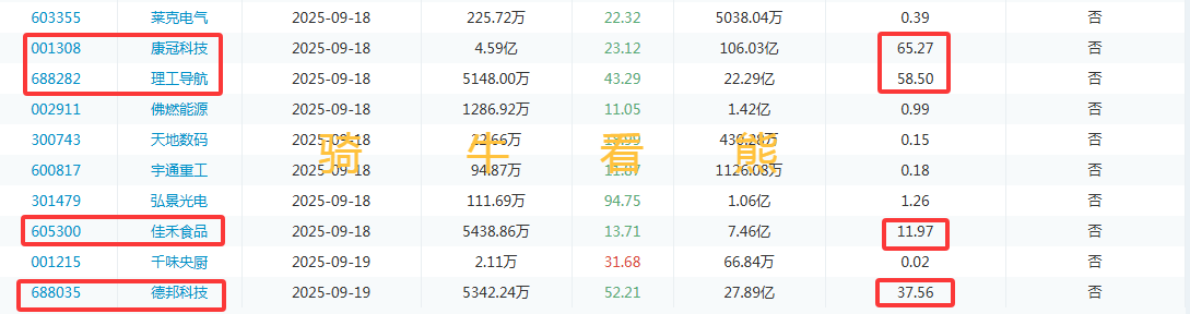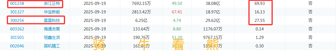 9月19日(周五)德邦科技解禁比例达到37.56%;浙江正特解禁比例达到69.93%;星星科技解禁比例达到27.55%。
