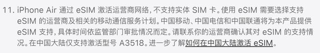 苹果官网现已显示,iPhone Air 通过 eSIM 激活运营商网络,不支持实体 SIM 卡。使用 eSIM 需要选择支持 eSIM 的运营商及相关的移动通信服务计划。中国移动、中国电信和中国联通将为本产品提供 eSIM 支持,具体时间依监管部门审批情况而定。请联系运营商确认其对 eSIM 的支持情况。