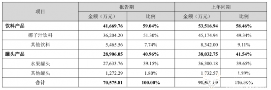 从产品类别来看,半年报数据显示,今年上半年,欢乐家两大系列产品收入较去年同期均有所下降,其中饮料产品收入4.17亿,同比下降22.14%,而罐头产品收入2.89亿元,同比下降24.00%。