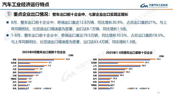 8月份整车出口前十企业中,奇瑞出口量达12.8万辆,同比增长30.9%,占总出口量的21%。