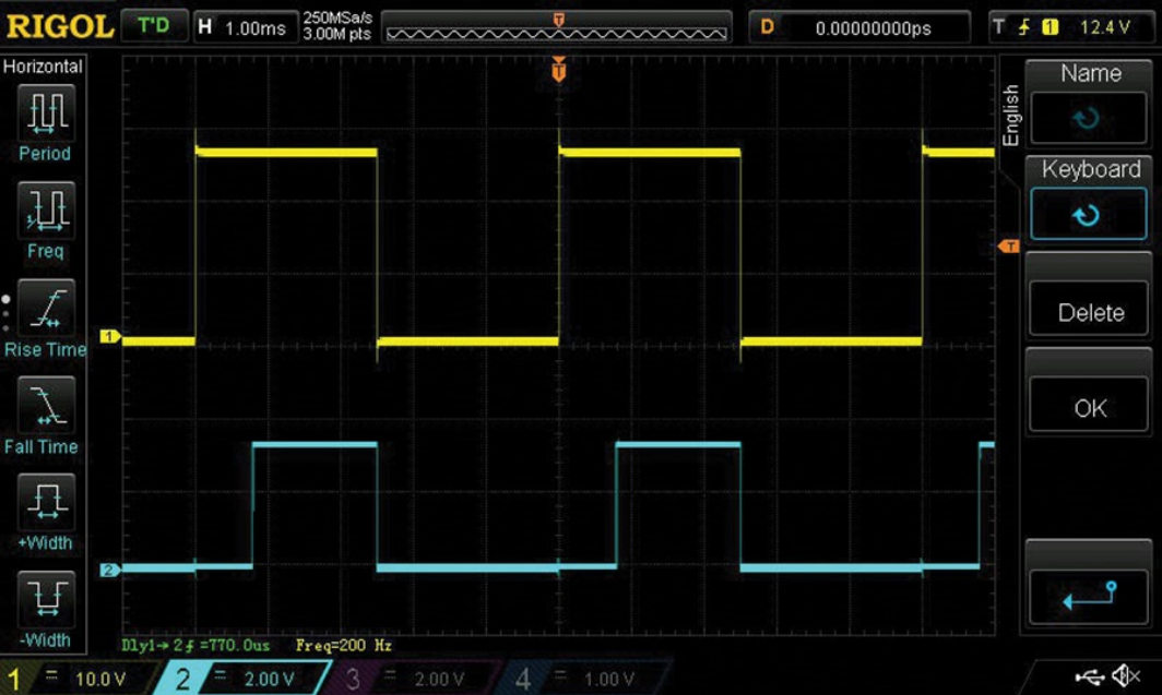 图6显示了使能800 µs毛刺滤波器且输入以50%占空比切换时的LED输出信号。上升沿延迟约770 µs,而下降沿没有延迟。这说明滤波器未能妥善处理LED输出。