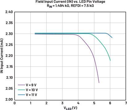 对于接近11 V电平的三个现场输入电压(9 V、10 V和11 V),图2显 示了实测的现场IN电流与LED引脚电压的依赖关系。之所以选择 10 V和9 V电平,是因为它们处于3型输入的过渡区间内,并且它 们的输入电流没有最小值要求,而11 V要求输入电流的最小值为 2 mA。