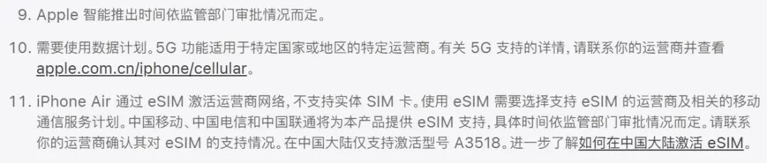 此前,苹果中国官网显示,iPhone Air(型号A3518)是目前中国大陆地区唯一支持eSIM的iPhone。苹果同时确认,中国联通是中国大陆地区唯一受支持的iPhone eSIM 运营商,买完手机后用户得去线下营业厅激活eSIM。
