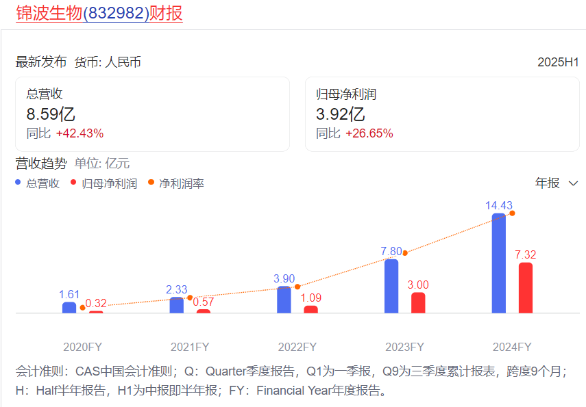2025年上半年,锦波生物营业收入为8.59亿元,同比增长42.43%;归母净利润3.92亿元,同比增长26.65%;扣非净利润为3.87亿元,同比增长27.56%。