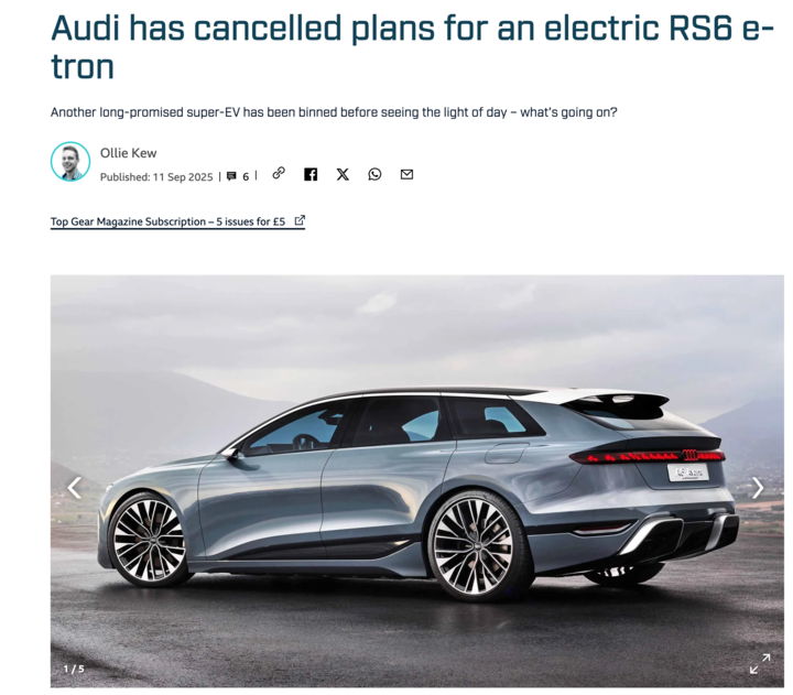 例如,奥迪在最近决定砍掉 RS6 e-tron 项目,专注于燃油 RS 系列的开发,奥迪认为在目前的市场环境下,RS6 的粉丝们对这种双电机超级旅行车的需求不足,市场前景堪忧。
