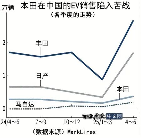 本田在中国销售的纯电动汽车(EV)表现不佳。尽管2025年春季投放了新款EV,但4~6月在中国的EV销售陷入负增长。与中国当地竞争对手相比,本田在价格和驾驶辅助功能方面处于劣势,消费者反应迟缓。本田不得不下调最初的价格,如何确立EV品牌成为紧要课题。