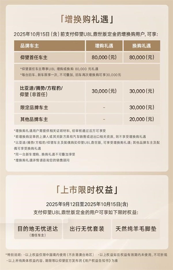 同时,官方推出仰望首任车主增换购礼遇,2025年10月15日(含)前支付仰望U8L鼎世版定金的增换购用户,可获得增换购礼遇80000元。
