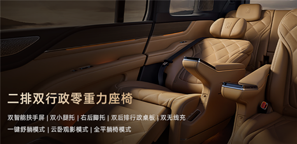 二排双行政零重力座椅标配18点按摩、头枕音响、智能感温扶手、行政桌板等豪华配置,支持一键开启零重力模式,还拥有云卧观影模式、一键舒躺模式、全平躺椅模式三大二排专属模式