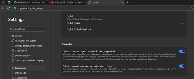 在测试中,该功能可在 YouTube 视频上使用。启动后,Edge 会下载 AI 模型,自动静音原视频音频并生成翻译音轨。翻译延迟不明显,但准确性难以完全确认。