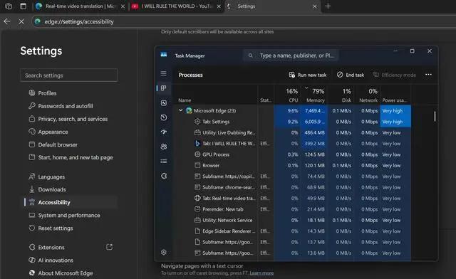 该功能对硬件要求较高,需至少 12GB 可用内存和四核 CPU,低配设备难以满足运行需求。在运行翻译时,Edge 会持续占用大量内存,影响其他应用的可用资源。测试显示,即便是在 16GB 内存的设备上,Edge 也几乎用满了 12GB 可用内存。