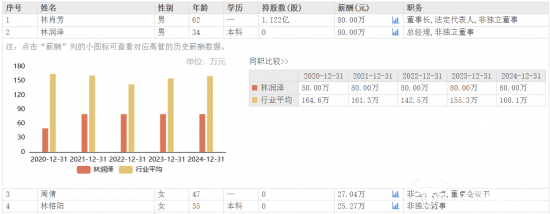 而在去年公司增利不增收的背景下,公司高管薪酬基本维持稳定。林润泽2024年薪酬为80万元,与董事长林肖芳持平,已连续四年保持不变。而董事会秘书周倩薪酬由2023年的27万元上调至2024年的27.04万元。