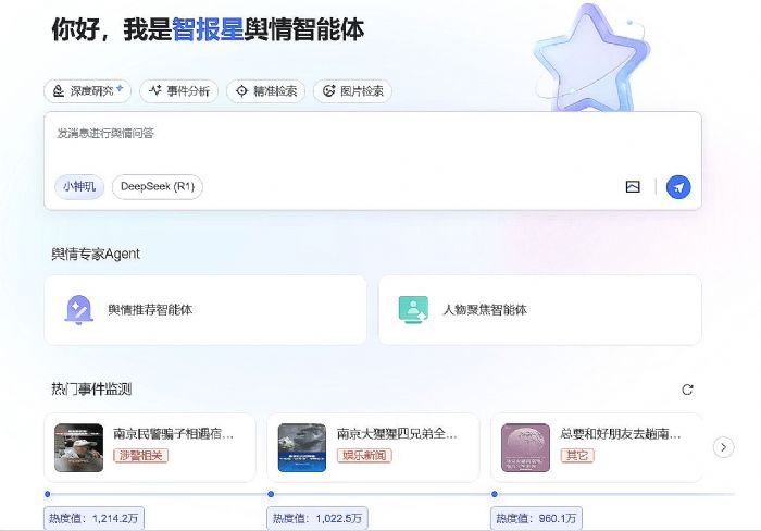 传统的舆情监测系统仍困于数据碎片、响应滞后与操作复杂的泥潭之中。中科天玑“智报星舆情智能体”依托十六年大数据技术积累,集成三大核心智能体,提供全方位、多模态、深语义的舆情治理能力: