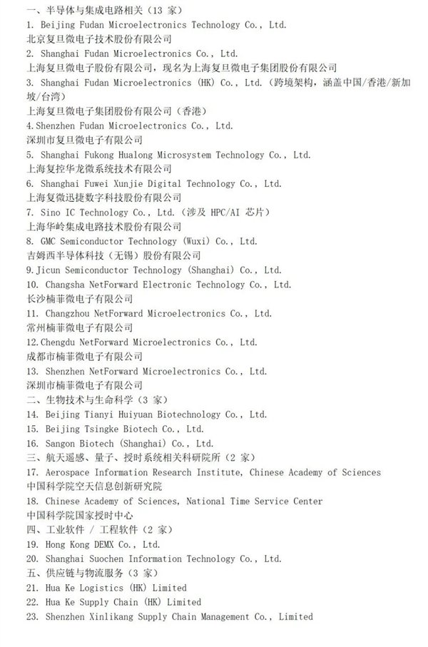 美国商务部工业与安全局(BIS)发布公告,将23家中国实体列入实体清单。美方称这些公司或机构存在“违背美国国家安全或外交政策利益”的行为。
