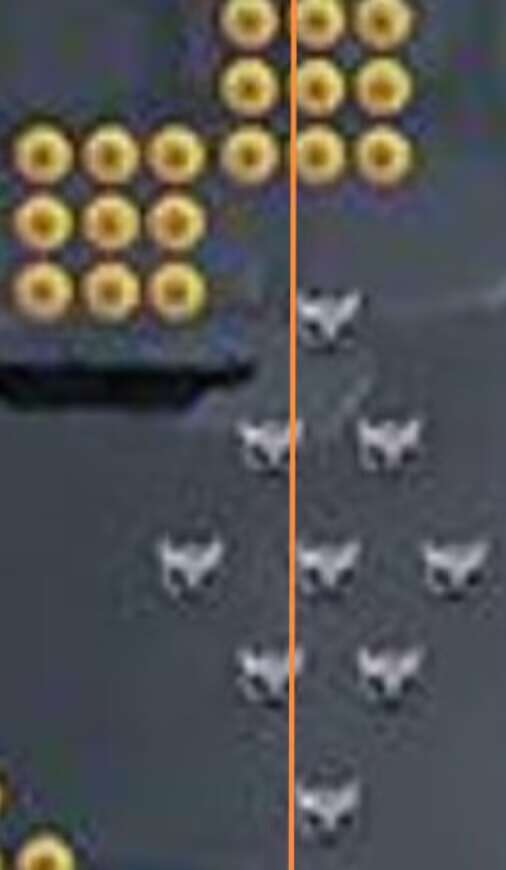 要吸入图中第二组金币第二列的三个金币,同时避开第三列的三个黑金币,开口仅有约十分之一个金币大小。