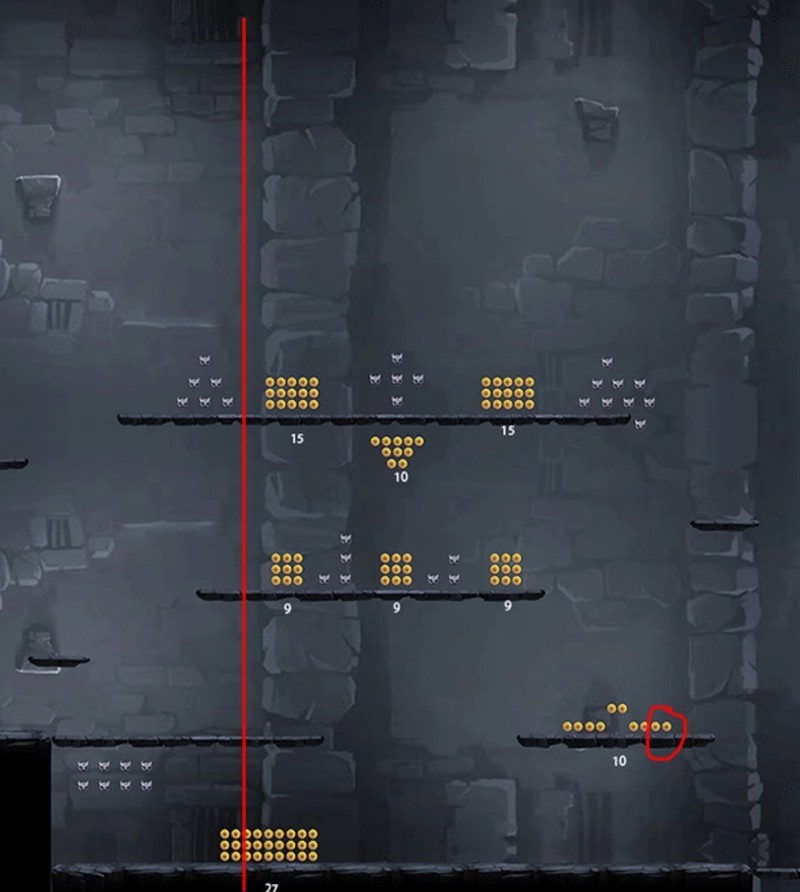 副手金令剑的开启点在红圈位置,无法吸到底部前一至两列的金币,因此前两列需快速下落以确保吃满。