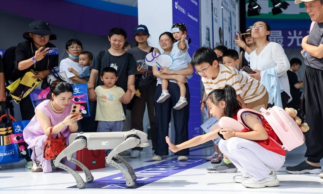 女孩遛着智能仿生机器恐龙逛展,一路被人围观;情感陪伴机器女孩一脸不高兴,程序员解释,隔壁的机器人打鼓太吵,“不吵了她才会高兴”……