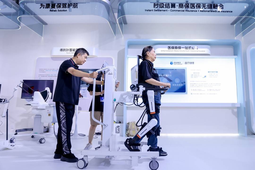 老人穿戴着助行外骨骼,轻快地走动;