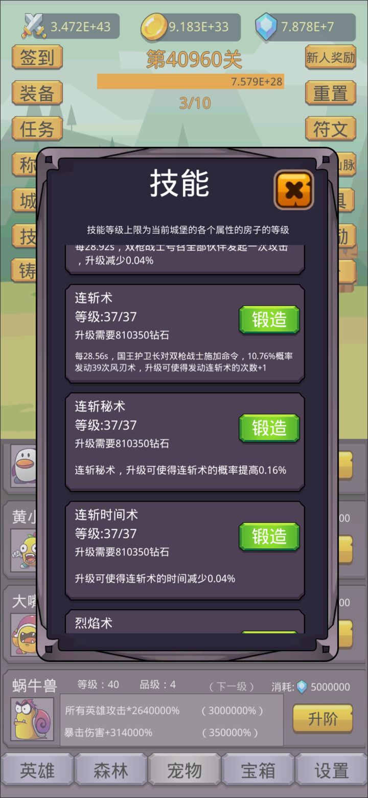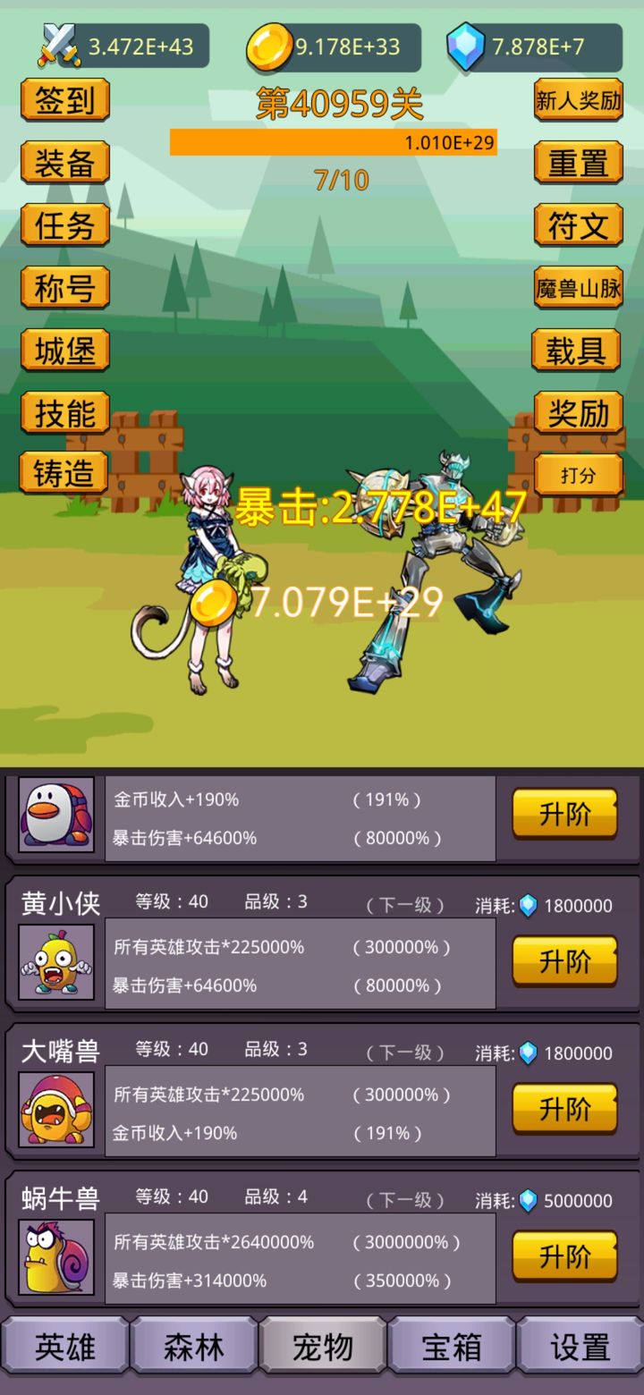每天观看广告可获得大量钻石,用于提升宠物。首日尽量解锁全部12个宠物,并优先升级带有暴击值的宠物。后续重点培养能提升暴击伤害和全体英雄攻击的宠物,如狂暴蜗牛、哥布鸟、黄小侠和蜗牛兽,接着再提升增加英雄攻击的宠物。每天看完广告后进行升级,适当预留部分钻石用于学习技能。