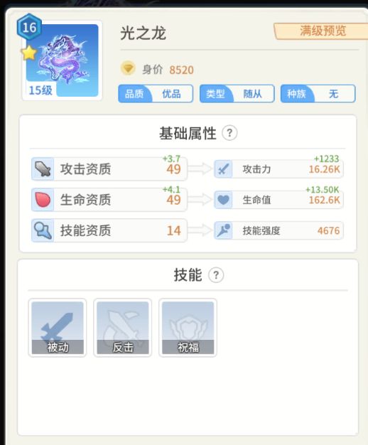 蓝卡推荐光龙-天使,高费卡,攻高血厚,前期关卡表现稳定,是不错的选择。