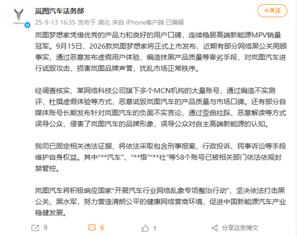 岚图梦想家凭借优秀的产品力和良好的用户口碑,连续稳居高端新能源MPV销量冠军。9月15日,2026款岚图梦想家将正式上市发布,近期有部分网络黑公关罔顾事实,通过恶意发布虚假用户体验、编造抹黑产品质量等卑劣手段,对岚图汽车进行诋毁攻击,损害岚图品牌声誉,扰乱市场正常秩序。