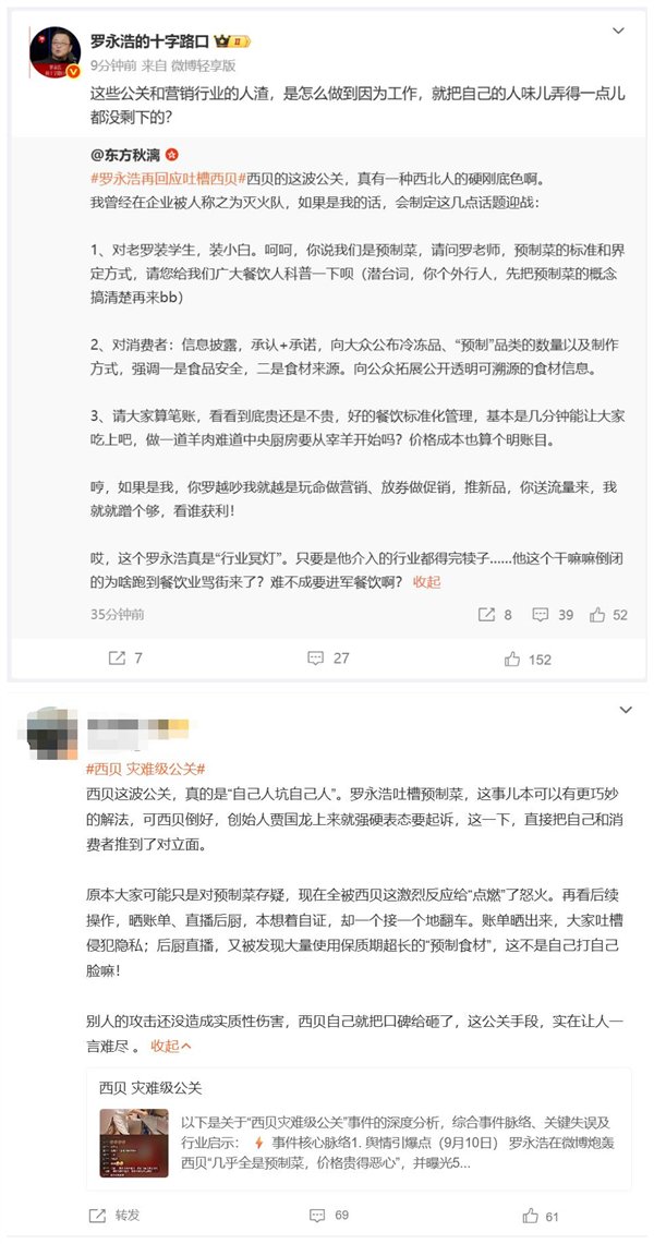 微博上不少网友称西贝公关是“灾难级”,有网友指出,西贝这波公关真的是“自己人坑自己人”,罗永浩吐槽预制菜,这事儿本可以有更巧妙的解法,可西贝倒好,创始人贾国龙上来就强硬表态要起诉,这一下直接把自己和消费者推到了对立面,别人的攻击还没造成实质性伤害,西贝自己就把口碑给砸了,这公关手段实在让人一言难尽。