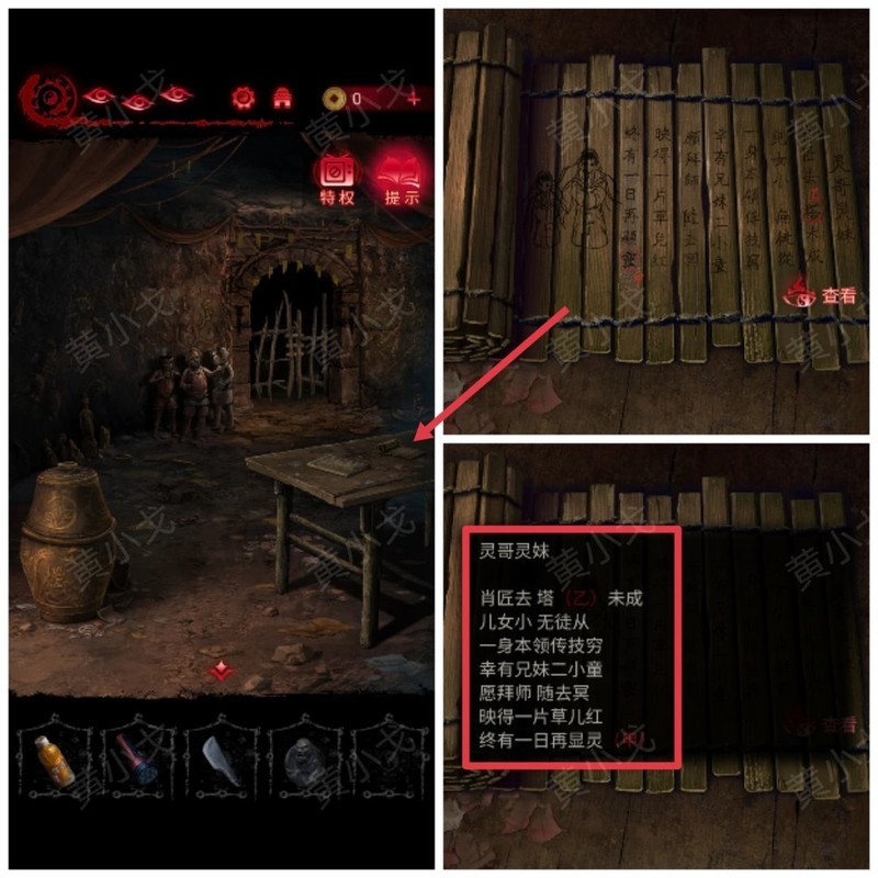 进入山洞,查看桌上竹简,获取线索:塔对应乙、灵对应甲。