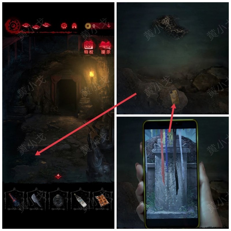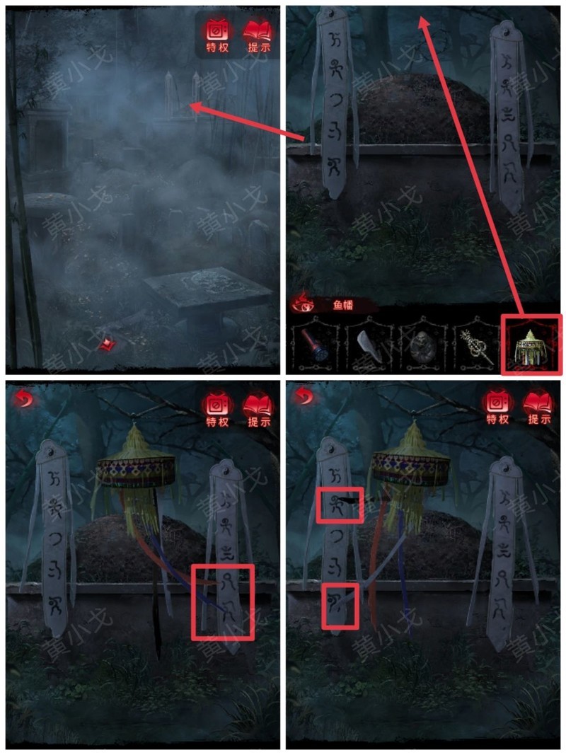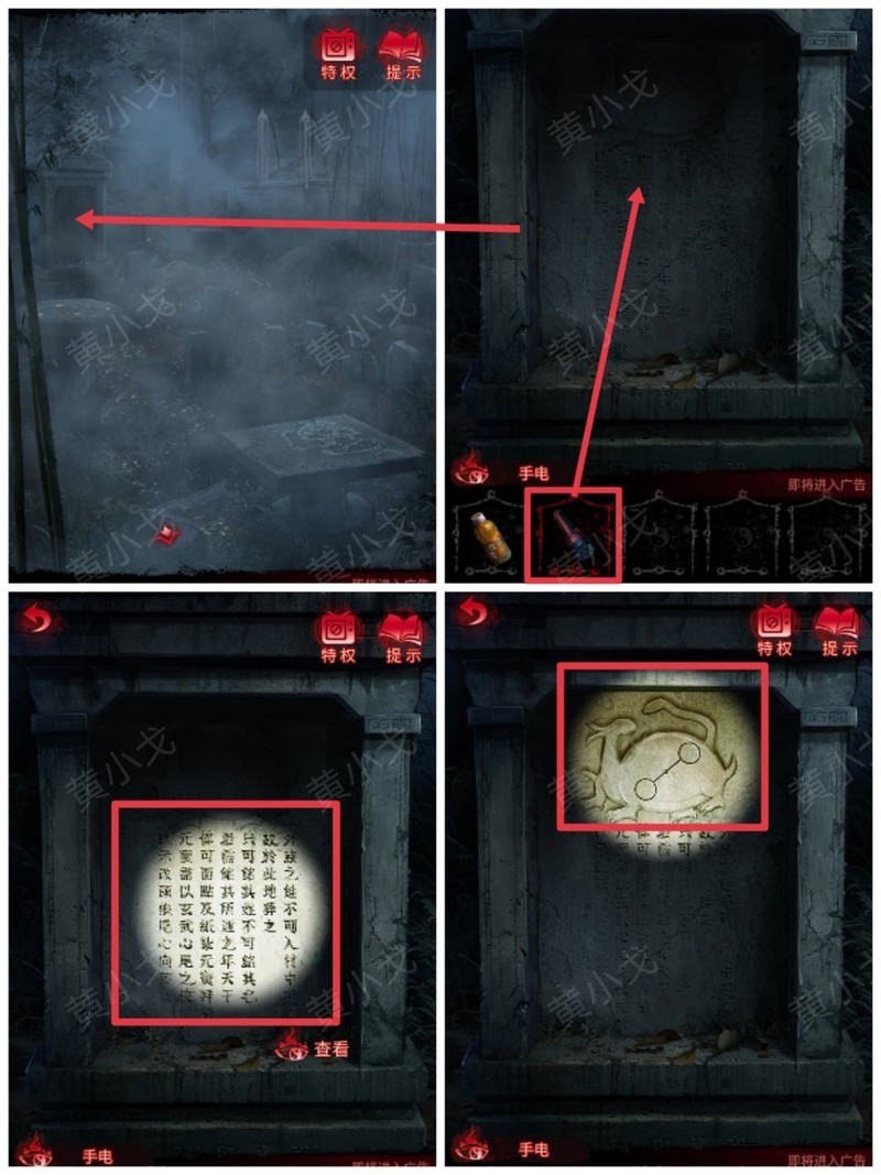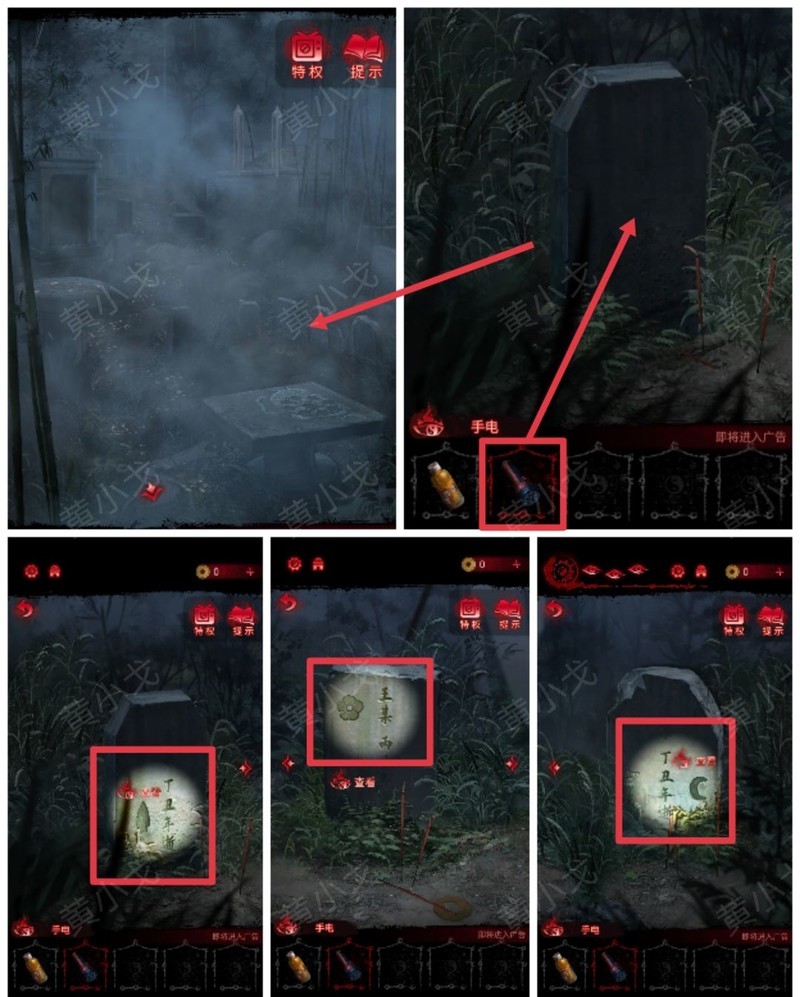 在坟场场景中,点击地面墓碑,用手电照射,获取墓碑文字与图案线索(注意最后一块墓碑有惊悚提示)。