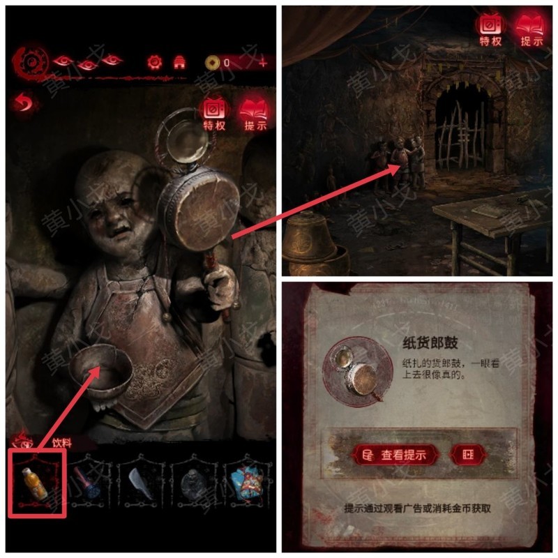 点击童子雕像,将饮料倒入碗中,获取纸货郎鼓。
