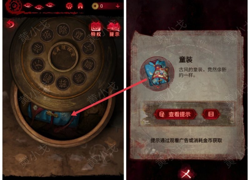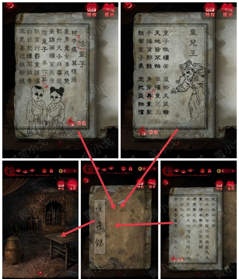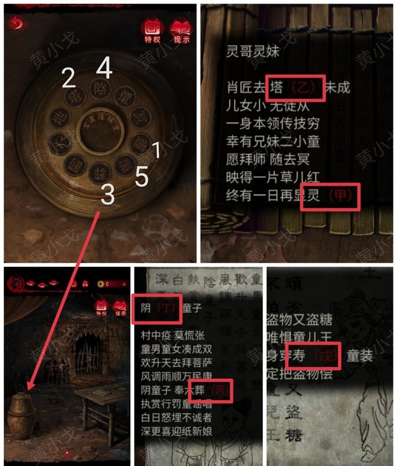 点击缸体,依照盖面童谣提示,结合竹简与童子禄线索,按灵塔葬阴寿顺序按下甲乙丙丁戊按钮。