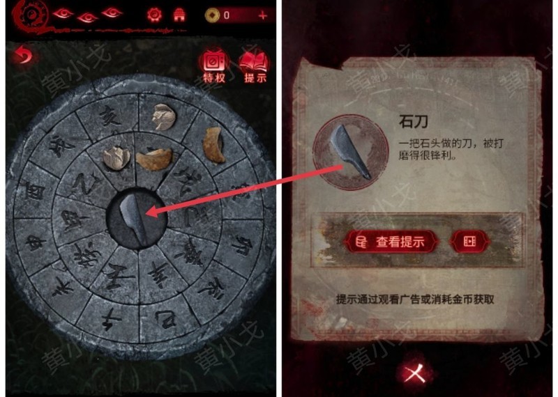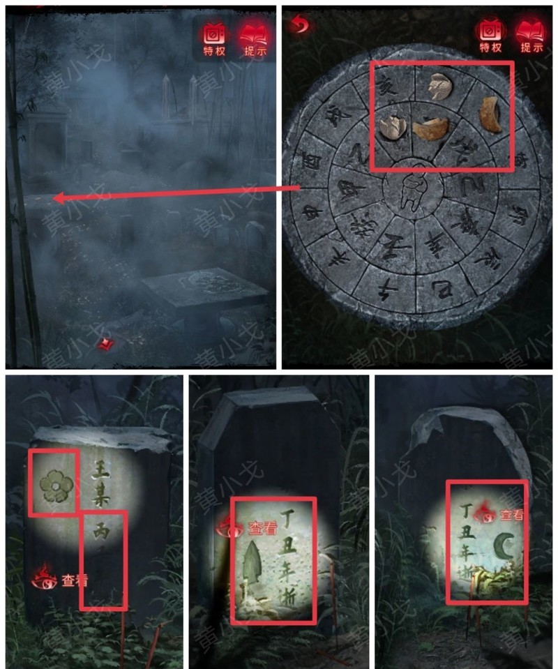 点击圆形石盘,按照墓碑提示将物品正确摆放(丁丑年放剑形、丙子年放花形、丁丑年放月牙形)。