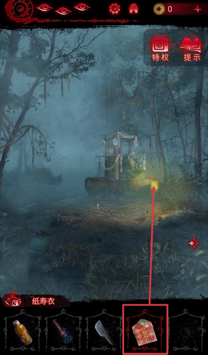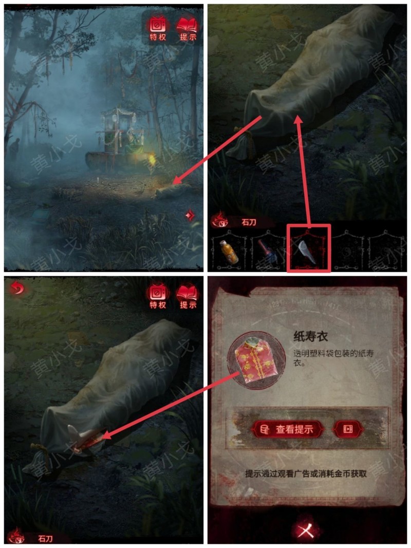 在树林中找到地上的袋子,用石刀割开后取得纸寿衣。