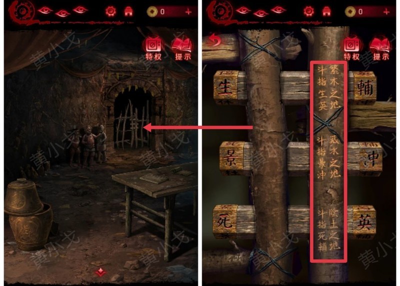 在山洞外点击石门,依据外圈颜色提示,结合坟场鱼幡线索,调整机关文字以开启石门。