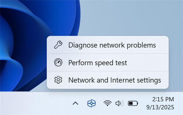 Windows 11的任务栏网络弹出窗口将新增一个网速测试按钮,位置就在Wi-Fi刷新按钮旁边,为用户提供快速进行在线网速测试的途径。