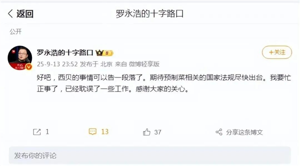 就在昨日晚间,罗永浩曾发文,西贝的事情可以告一段落了,并称期待预制菜相关的国家法规尽快出台。